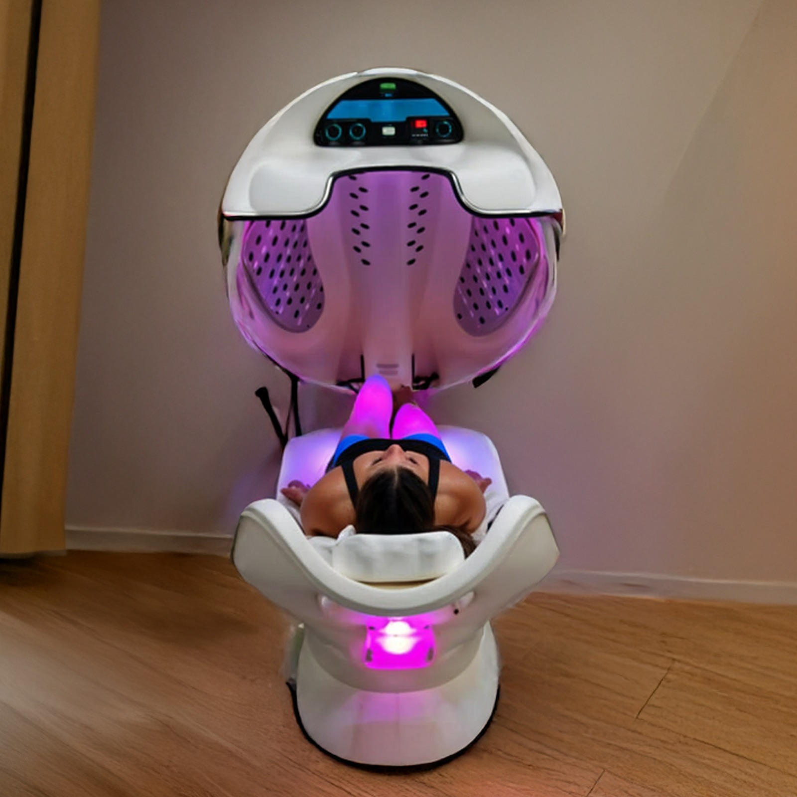 Each session lasts around 30–45 minutes. You’ll lie inside a futuristic capsule that gently warms and stimulates your body while you relax, nap, or listen to music. It’s comfortable, safe, and requires no recovery time.